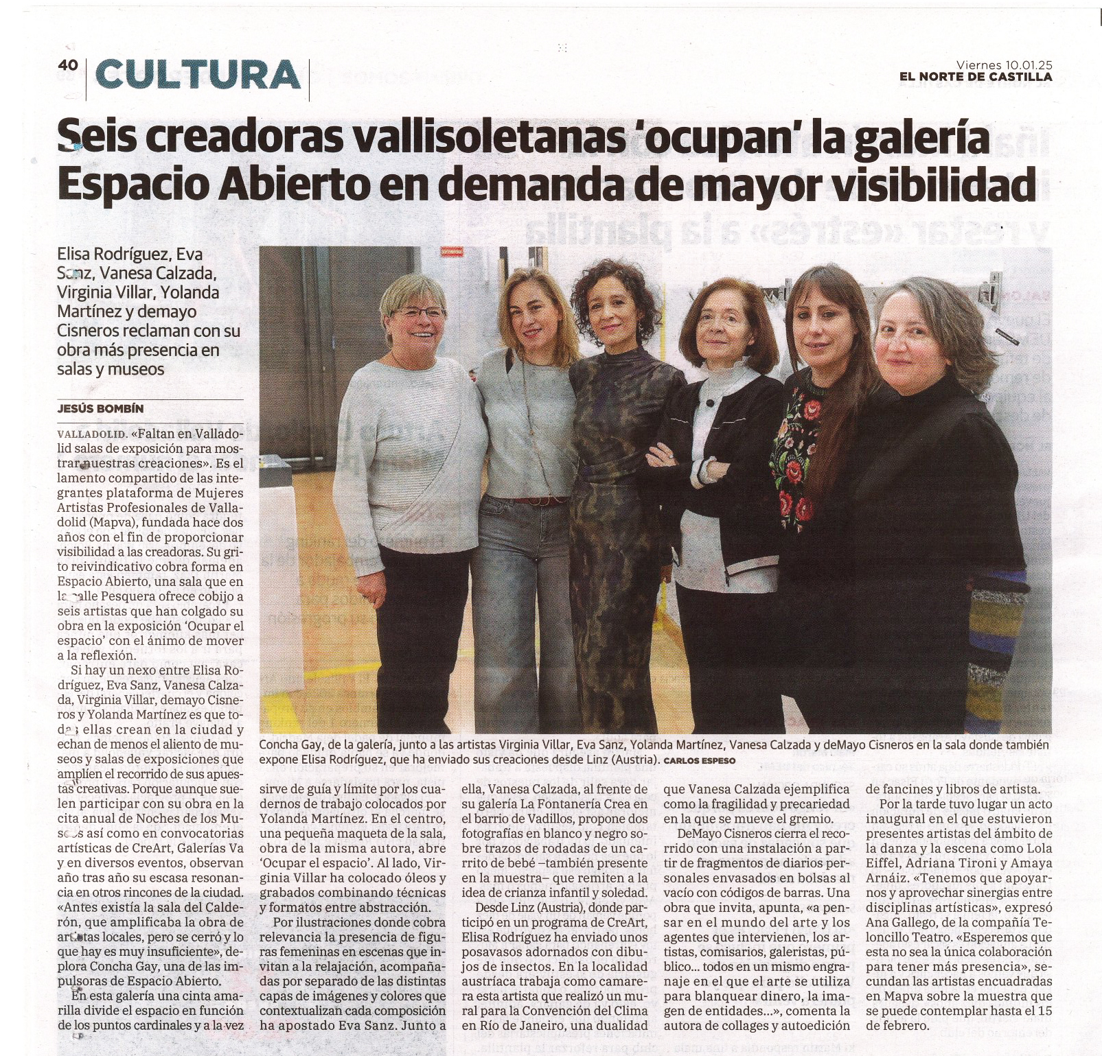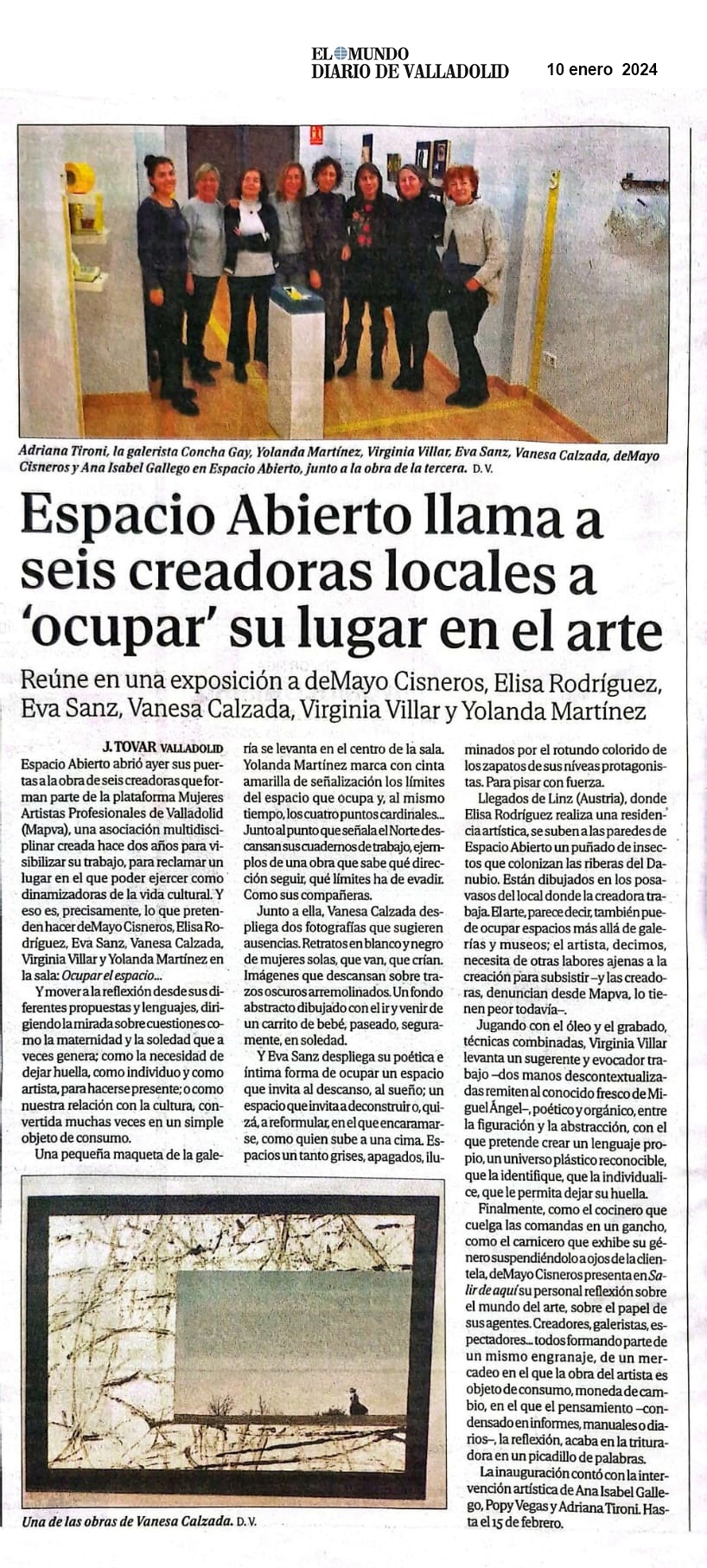 Este jueves a las 19h inauguramos exposición en la galería Espacio Abierto, arte y cultura contemporánea. Seis de las artistas plásticas de MAPVA han creado una serie de obras en torno a la temática «OCUPAR EL ESPACIO». Han establecido tres líneas de inspiración: ocupar el espacio personal (Virginia Villar y Eva Sanz), el espacio arquitectónico (Yolanda Martínez y Vanesa Calzada Rodríguez) y expositivo (Elisa Rodríguez y deMayo Cisneros). Durante la inauguración habrá una intervención poética de varias compañeras de MAPVA de artes escénicas: Ana Teloncillo, Popy Vegas, Carla Rico y Adriana Tironi.